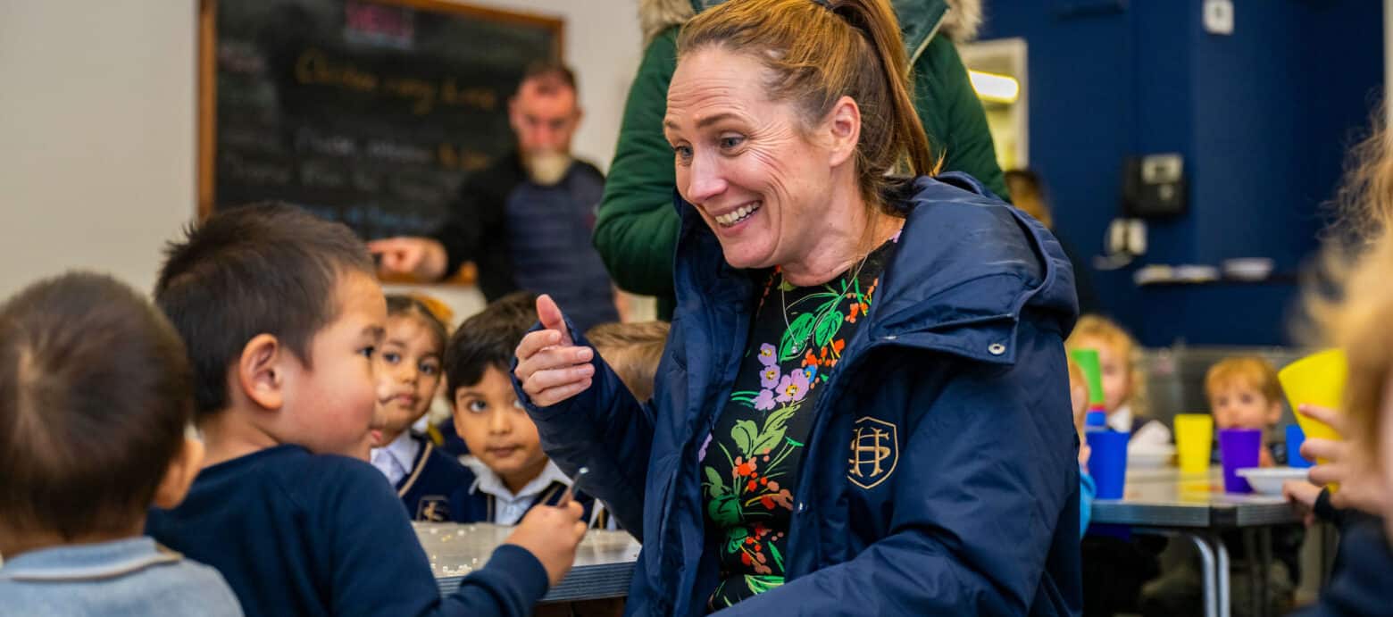 At lunchtime, the children all go over to the Wise Hall and sit around the table together to share a family meal. The children pass around cutlery before the lunch is served by their adults. After lunch, the children head out to playtime in the early years garden or in their classrooms for free play.